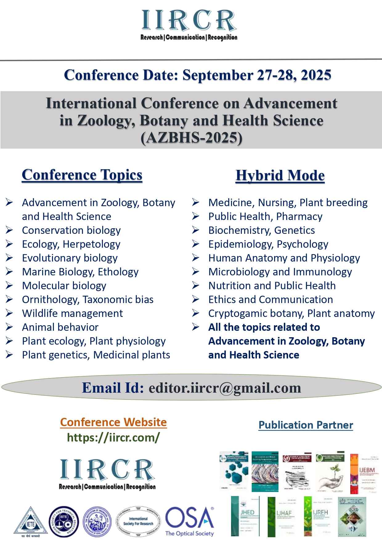 Abstract Submission email id: editor.iircr@gmail.com